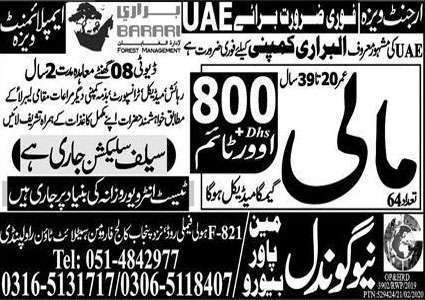 However, the given newspaper advertisement for Arab Emirates gardener jobs demand age limit in between 20 to 39 years. However, candidates can contact for further details though given contact numbers.