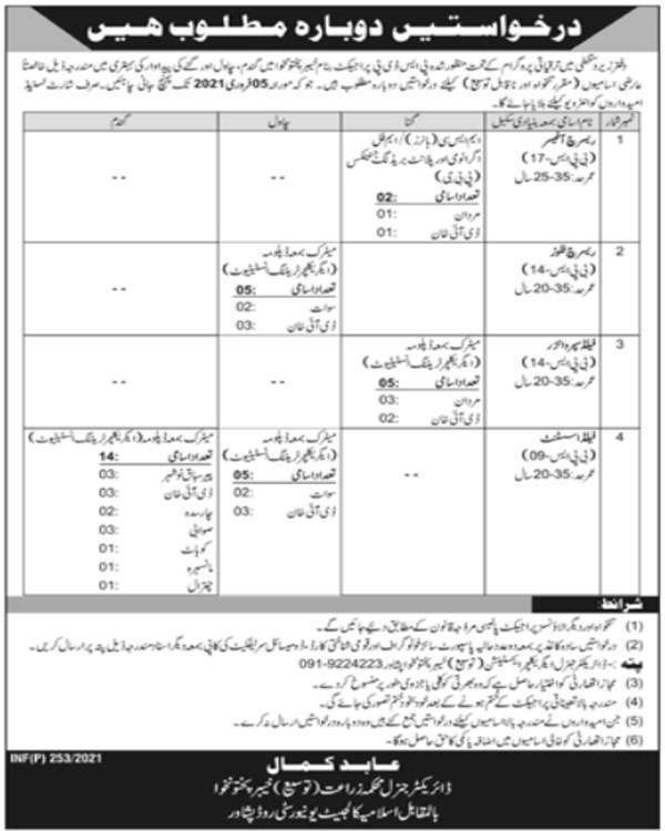 The Agriculture Department Government KPK jobs are published in the daily Aaj newspaper on 15th January 2021. These jobs are on contract basis, but included in Government sector. Above mention Agriculture Department Government KPK jobs invite application from both male and female candidates. However, relevant experience and skill is necessary for these vacant positions in Agriculture Department Government KPK. The last date for these application is 05th February 2021.