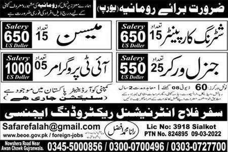 Jobs in Romania for Pakistani, Indian, Bangladeshi and other nationals are open. However, at this moment Romania construction company needs 15 shuttering carpenter, 25 general workers, 15 mesons and 5 IT programmers. Moreover, these entire advertised jobs offer good salary packages with other facilities.
