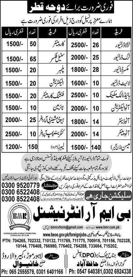 Construction workers jobs in Doha Qatar advertised by BMR International. Construction workers jobs in Doha Qatar for Trailer driver, truck driver, mixer driver, light driver, Hydraulic mechanic, Auto electrician, Auto denter, Auto painter, Meson, Carpenter, Steel fixer, Plumber, Electrician, Finishing carpenter, Tire man, Heavy machinery operator, Concrete pump operator and laborer. However, these Doha Qatar worker jobs are urgently required by employer. Here, we have full jobs details for interested candidates.