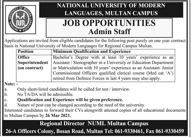Candidate having interest in this job can send their curriculum vitae along with attested relevant documents to Multan Campus by 26th march, 2021.