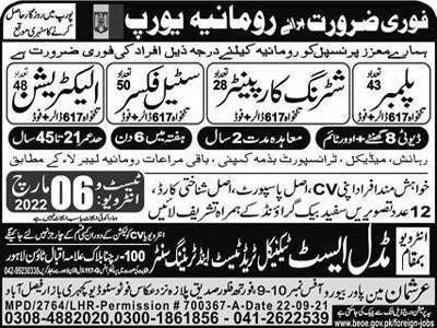 Latest Romania Europe jobs vacancies 2022 advertised by Middle East Technical Trade. However, latest Romania Europe jobs vacancies 2022 are open for Plumber, Shuttering carpenter, Steel fixer and Electrician. But, jobs in Romania are open for 43 Plumbers, 28 Shuttering carpenters, 50 Steel fixers and 48 Electricians. However, Romania jobs and vacancies are for skilled male candidates. But, job vacancies in Romania for foreigners offer handsome salary package and other recommended facilities. Therefore, Romania jobs for Indian, Pakistani and other foreigners skilled workers. So, we have full Romania Europe job vacancies details.
