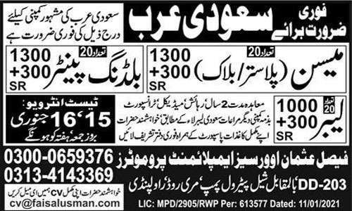 All advertised jobs mentioned in this advertisement also have details about the salary packages. The employees for this company will be hired for two years. Saudi Arabia Construction jobs will provide accommodation, medical facility and transportation. It is necessary for the candidates that they must visit along with their necessary documents and valid passport. The head or relevant of this Saudi Arabia Construction Company will conduct test and interview on 15 and 16 January, 2021 at Rawalpindi.