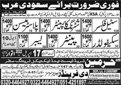 The given newspaper advertisement for Saudi Arabia jobs for construction workers demand age limit in between 22 to 40 years. However, candidates can contact for further details though given contact numbers.