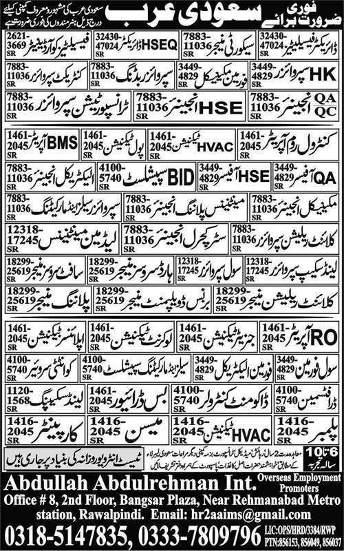 Urgent staff required in Saudi Arabia for a famous Saudi Company. Urgent staff required in Saudi Arabia in different fields. Saudi Arabia needs following urgent staff. But, these advertised jobs are for technical and skilled male candidates. Therefore, these vacancies are for qualified and experienced applicants. Urgent staff required in Saudi Arabia demand 6 to 10 years relevant experience. But, interested candidates can consult the provided job advertisement taken from the newspaper. We have full details of the vacancies vacant in Saudi Arabia. So, all jobs title are enlisted in advertisement with offered salaries range.